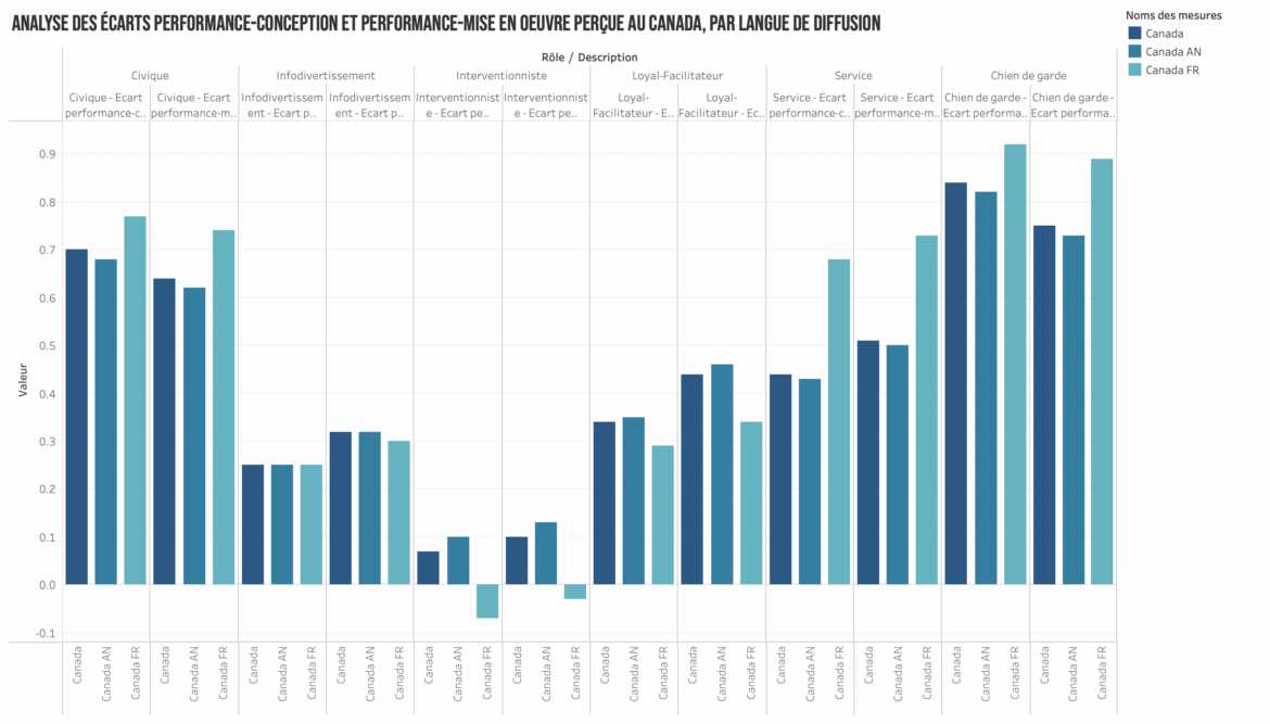 Performance des rôles journalistiques au Canada, par langue de diffusion